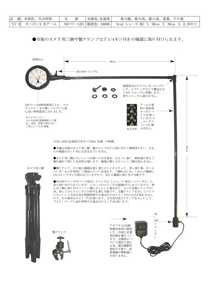 品番718のハロゲンの詳細はこちらのページを参考にして下さい。光源部と電源以外共通です。